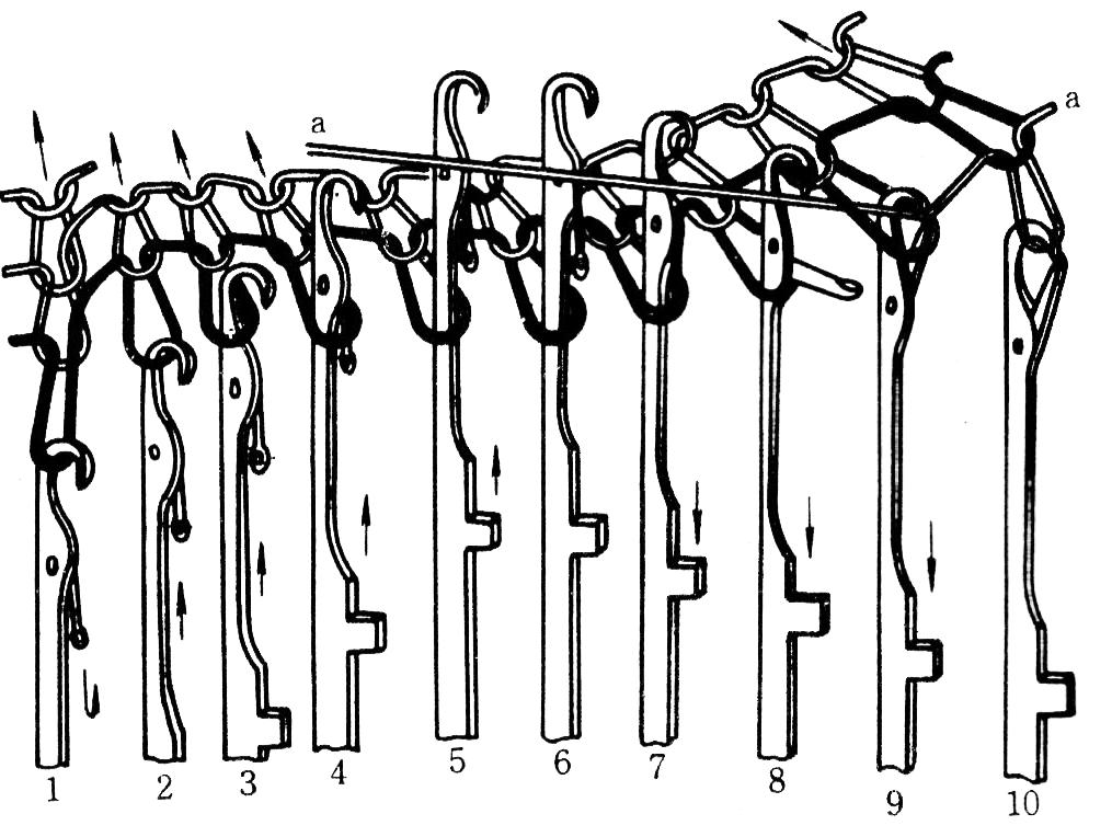 成圈過(guò)程:退圈—墊紗—閉口—套圈—彎紗—脫圈—成圈—牽拉(見(jiàn)圖示)